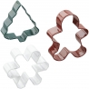 Zestaw metalowych foremek do pierniczków w kształcie choinki, płatka śniegu oraz piernikowego ludzika.