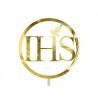 Zestaw 5 zotych topperów na tort z okazji I Komunii Świętej z napisem IHS. Wykonane z ozdobnej tekturki.