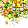 Cudowna wielkanocna posypka marki Happy Sprinkles. Uświetni Twoje wypieki, natychmiast po zaaplikowaniu doda im uroku, koloru i wdzięku. Wspaniała ozdoba na słodkie stoły, torty, ciasta, ciasteczka, muffiny, babeczki, cakesicles i inne desery. W posypce znajdziesz słodkie dekoracje w kształcie pisanek, marchewek, głowy króliczka oraz drobne pałeczki w kolorze zielonym, białym, żółtym; zielone perełki; białe kuleczki.