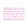 Zestaw zawiera 26 dużych i 26 małych liter, cyfry od 0 do 9 oraz symbole "&, #, !, ?".