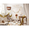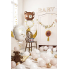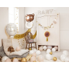 W skład zestawu wchodzi 13 papierowych zawieszek (7 elementów ozdobnych oraz litery tworzące napis "Oh Baby"), 4 frędzle i złoty sznurek.