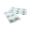 Forma silikonowa uznanej włoskiej firmy Silikomart z linii 3d range do przygotowania 6 nowoczesnych deserów w kształcie spłaszczonych kul ze skośnymi wgłębieniami na bocznych powierzchniach.