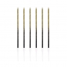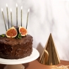 Efektowna dekoracja urodzinowa na tort. Długie i cienkie świeczki, złoto-czarne z brokatowym połyskiem, to eleganckie uzupełnienie każdego tortu urodzinowego i okolicznościowego. W zestawie 6 plastikowych podstawek w kolorze białym, ułatwiające umocowanie świeczek na torcie.