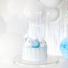 Efektowna dekoracja urodzinowa na tort. Długie świeczki w kolorze niebieskim.