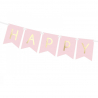 Banner urodzinowy z napisem Happy Birthday, złote litery na różowym tle.