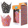 Papilotki z nadrukiem - dwa wzory po 12 papilotek! Zestaw czarno-fioletowych papilotek z motywem księżyca, gwiazd, nietoperzy i dyń. Efektownie prezentują się po upieczeniu. Papilotki wykonane z odpornego na tłuszcz papieru. Aby muffinki zachowały kształt w trakcie wypiekania polecamy Formę do pieczenia muffinek.