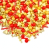 Cudowna posypka świąteczna Christmas Elegance, to mix zawierający kule czekoladowe w kolorze czerwonym i złotym, złote i czerwone pałeczki, złote trójkąty. Wspaniała ozdoba tortów, ciast, muffinów, cakesicles i innych deserów. Idealna dekoracja słodkości, również na pierniczki bożonarodzeniowe. Piękna kompozycja różnych kształtów i kolorów sprawia, że posypka dodaje uroku i świątecznego klimatu od razu po zaaplikowaniu na Twoje desery i wypieki!