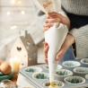 Rękaw cukierniczy wykonany z plastiku z antypoślizgową powierzchnią zewnętrzną i gładkim wnętrzem, co ułatwia wyciskanie. Jest miękki, miły w dotyku, wygodnie leży w dłoni. Produkt do wielokrotnego użytku.