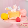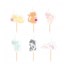Zestaw zawiera 6 świeczek w kształcie kolorowych kotków, każda umieszczona na drewnianym patyczku, co ułatwia wbicie ich w ciasto.