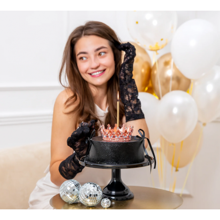 Ustaw koronkę na wierzchu tortu, najlepiej na stabilnej powierzchni. Jeżeli tort ma miękką masę lub krem, warto lekko wcisnąć podstawę korony, by uzyskać stabilność. Rose gold świetnie komponuje się z bielą, pudrowym różem, złotem lub motywem „księżniczka”.