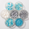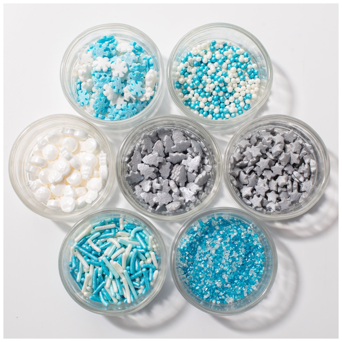 Ten zestaw zawiera aż 7 różnych mini-opakowań posypek cukrowych o tematyce zimowej i świątecznej — zawierające m.in. płatki śniegu, gwiazdki, zimowe kulki i inne motywy w kolorystyce bieli, srebra i błękitu. Idealne do dekorowania tortów, babeczek i ciastek, które mają przypominać zimowy krajobraz.