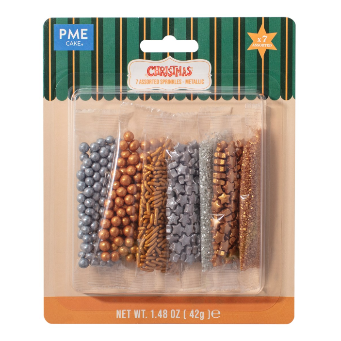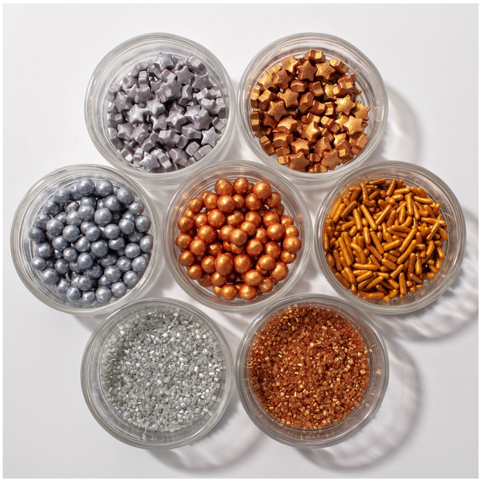 Ten praktyczny zestaw zawiera 7 mini-opakowań posypek o metalicznym wykończeniu — w różnych wzorach i kolorach metalicznych, takich jak złoto, srebro, miedź czy inne połyskliwe odcienie. Posypki zostały zaprojektowane tak, by dodać efekt „premium” dekoracjom, a jednocześnie były łatwe w użyciu przy akcesoriach cukierniczych.