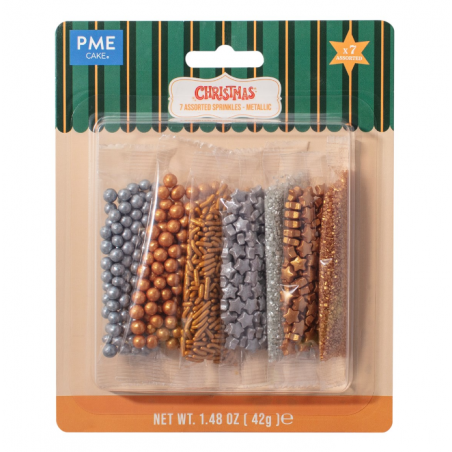 Dodaj elegancki blask swoim wypiekom! Zestaw metalicznych posypek 7 szt., PME to wysokiej jakości akcesoria cukiernicze, idealne do dekorowania tortów, ciastek, muffinek i innych deserów. W sklepie Tortytorty.pl znajdziesz bogaty wybór akcesoriów cukierniczych i dekoracji do tortów, dzięki którym Twoje wypieki będą wyglądać profesjonalnie.