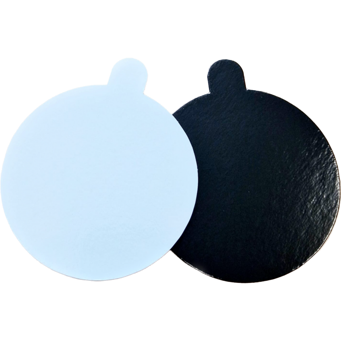Podkład jest dwustronny (biała i czarna powierzchnia), wykonany z kartonu o gramaturze 1050 g/m², co gwarantuje dobrą sztywność i trwałość. Średnica wynosi 8 cm, a konstrukcja zawiera wygodny uchwyt, który ułatwia podanie i transport monoporcji.