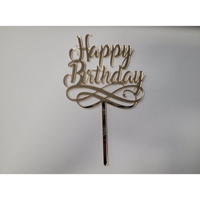 Topper ma układ napisu „Happy” nad „Birthday”, a pod słowem „Birthday” znajduje się ozdobny motyw fal, który nadaje całości lekkości i nowoczesnego wyglądu. Dzięki precyzyjnemu wycięciu laserowemu wszystkie detale są idealnie gładkie i wykończone. Dekoracja osadzona jest na szpikulcu, który pozwala łatwo i stabilnie umieścić topper w torcie.