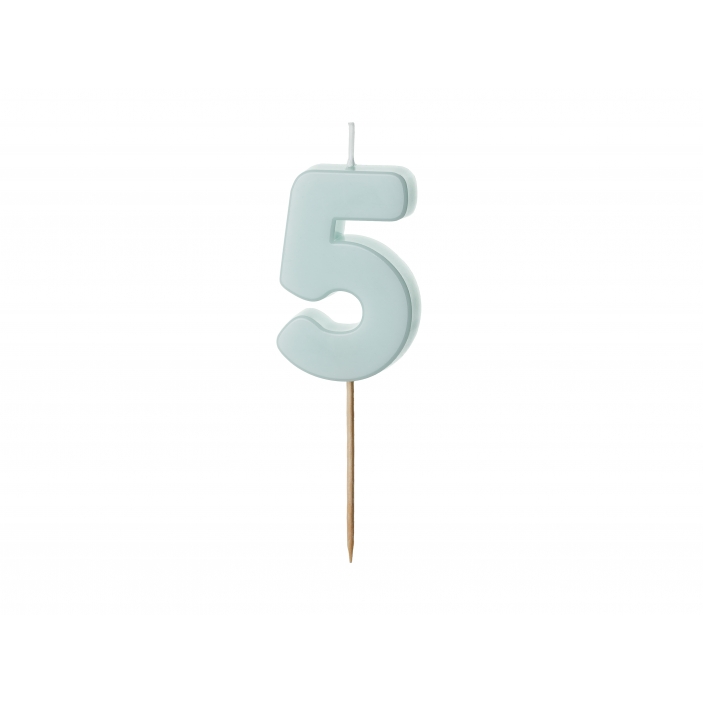 Świeczka ma wysokość ok. 5,5 cm i kształt cyfry „5”. Dzięki praktycznemu patyczkowi można ją łatwo i stabilnie umieścić na torcie, cieście lub babeczce. Jasnoniebieski kolor dodaje lekkości i elegancji każdej aranżacji słodkiego stołu.