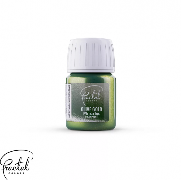 Barwnik spożywczy – metaliczna farbka Fractal Olive Gold w butelce 30 ml to wysokiej jakości farba w płynie o eleganckim, oliwkowo-złotym połysku. Jest gotowa do użycia, bardzo wydajna i idealna do dekorowania tortów, ciasteczek, figurek z masy cukrowej, czekolady czy pralinek. Dzięki intensywnemu pigmentowi pozwala uzyskać równomierny, efektowny metaliczny blask już po jednej warstwie.