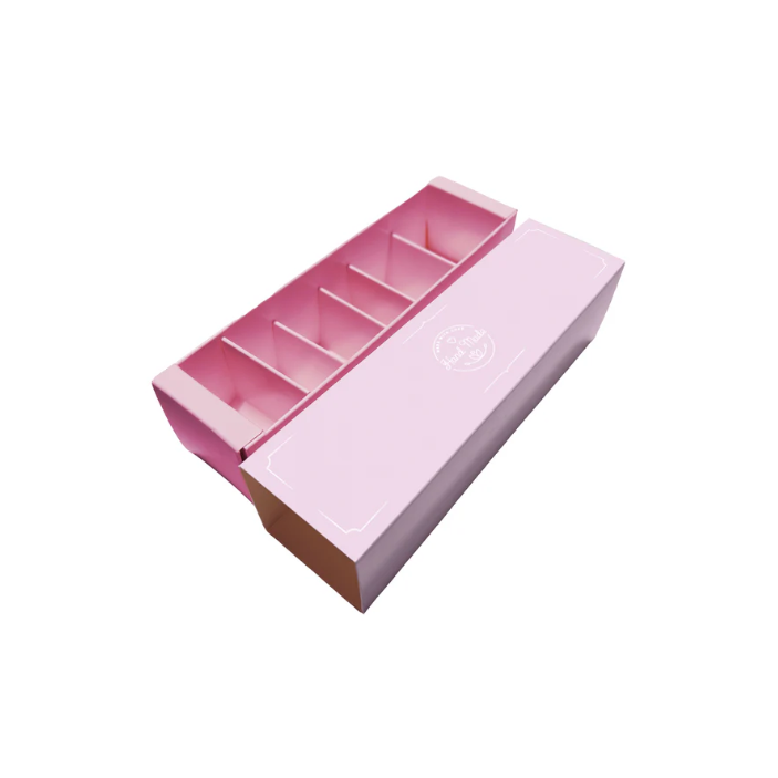 Pudełko na 6 makaroników dwuczęściowe w różowym kolorze to stylowe i praktyczne opakowanie na słodkie wypieki, idealne do prezentów, sprzedaży lub eleganckiej ekspozycji. Wykonane z solidnej tektury i estetycznie wykończone, pudełko pozwala na bezpieczne i efektowne zaprezentowanie kolorowych makaroników lub innych małych słodkości.