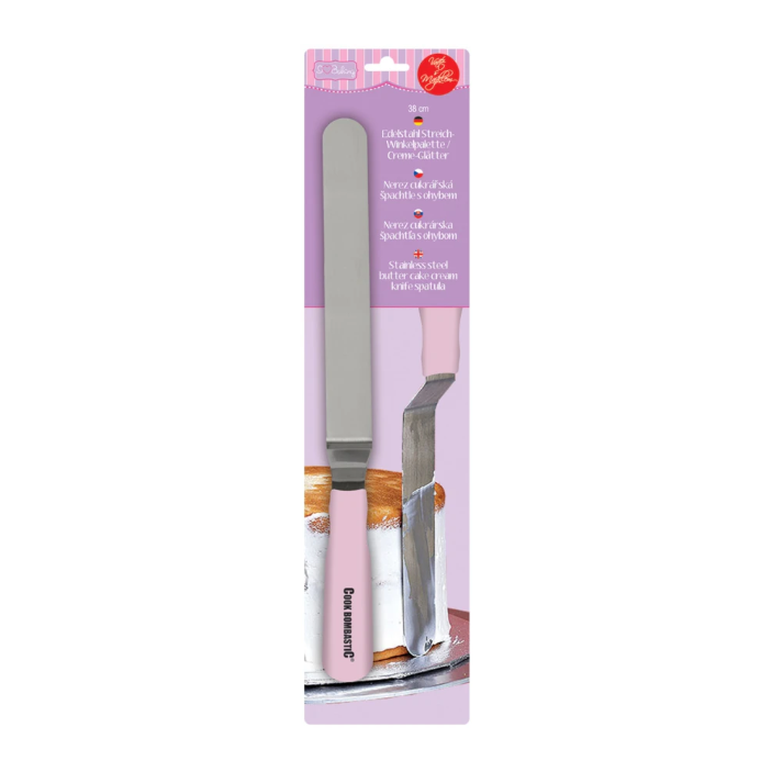 Kątowe wyprofilowanie ostrza umożliwia wygodne wygładzanie boków i górnych powierzchni wypieków bez konieczności dotykania tortu dłonią. Zapewnia to większą kontrolę nad ruchem oraz estetyczny, równy efekt końcowy. Szpatuła doskonale nadaje się do pracy z kremem maślanym, śmietanowym, ganache, a także z polewami i masami cukrowymi.