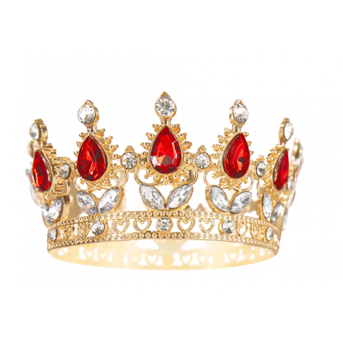Opis produktu – Dekoracja na tort korona złota z czerwonymi i srebrnymi kryształkami 10 cm, PartyPal