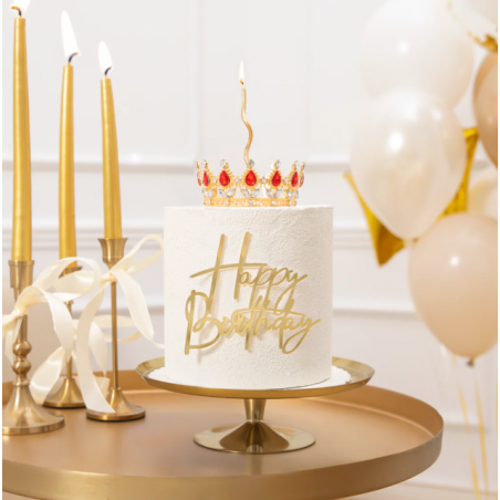 Korona została wykonana z połączenia metalu i tworzywa sztucznego, dzięki czemu jest trwała i stabilna na torcie. Złote wykończenie w połączeniu z czerwonymi oraz srebrnymi kryształkami pięknie odbija światło i przyciąga uwagę, podkreślając wyjątkowy charakter wypieków. Dekoracja ma średnicę około 10 cm i wysokość około 4,5 cm, dzięki czemu doskonale pasuje do standardowych tortów okolicznościowych. :contentReference[oaicite:0]{index=0}