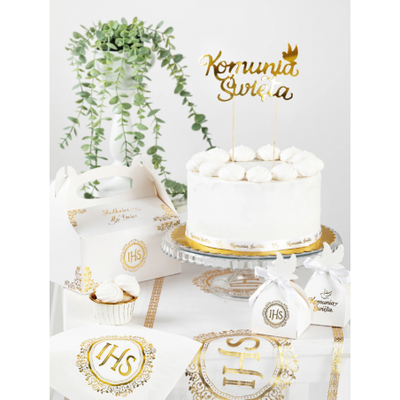 Pudełko na porcję ciasta, babeczkę, białe Komunia Święta złoty, 6 szt. to eleganckie i funkcjonalne opakowanie, które doskonale sprawdzi się podczas przyjęcia z okazji Pierwszej Komunii Świętej. Klasyczne połączenie bieli i złota z komunijnym motywem nadaje całości wyjątkowo uroczysty charakter i pięknie komponuje się z dekoracjami do tortów oraz stołu.