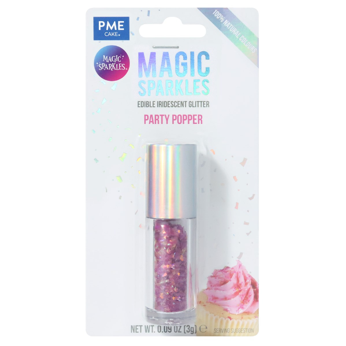 Brokat PME Magic Sparkles to wysokiej jakości, jadalna posypka, która zapewnia intensywny kolor oraz efekt pryzmatycznego połysku. Dzięki lekkiej strukturze łatwo się aplikuje i pozwala uzyskać zarówno subtelny, jak i bardziej wyrazisty efekt dekoracyjny.